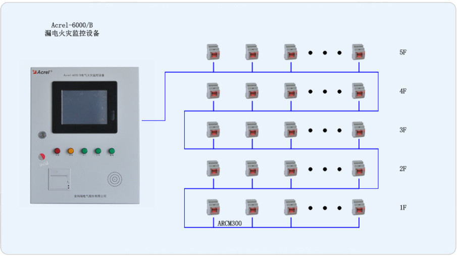 系統(tǒng)組網(wǎng)共分為站控管理層、網(wǎng)絡(luò)通訊層、現(xiàn)場設(shè)備層三層,該項(xiàng)目通訊總線共接入一條通訊總線,總線在樓層配電箱手拉手串接后,接入壁掛式后臺,組成電氣火災(zāi)系統(tǒng)的大動脈。箱體中漏電流互感器通過電流線接入漏電探測器,漏電探測器實(shí)時顯示漏電情況,組成一套信號穩(wěn)定,精度可靠的電氣火災(zāi)監(jiān)測系統(tǒng)。