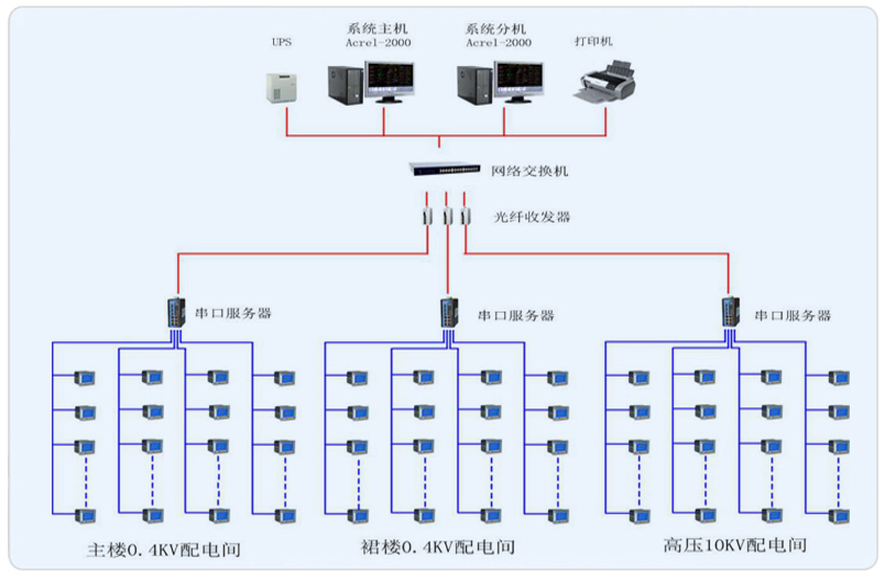 系統采用Acrel-2000型電力監控系統,整個系統采用網絡分布式結構,包含主樓0.4KV低壓配電室,裙樓0.4KV低壓配電室,10KV高壓配電室三個區域,3個數據采集箱。監控主機位于主樓地下一層的辦公室,監控分機位于主樓一層的消控中心,所有配電回路均配備安科瑞電力儀表PZ系列。該項目實現了福州郵政廣場2棟樓內電力系統的智能管理。所有監控設備均通過屏蔽雙絞線至各自配電室內的串口服務器,再通過光電轉換器經過光纖將數據傳輸至主樓地下一層的辦公室,從而實現遠程監控。